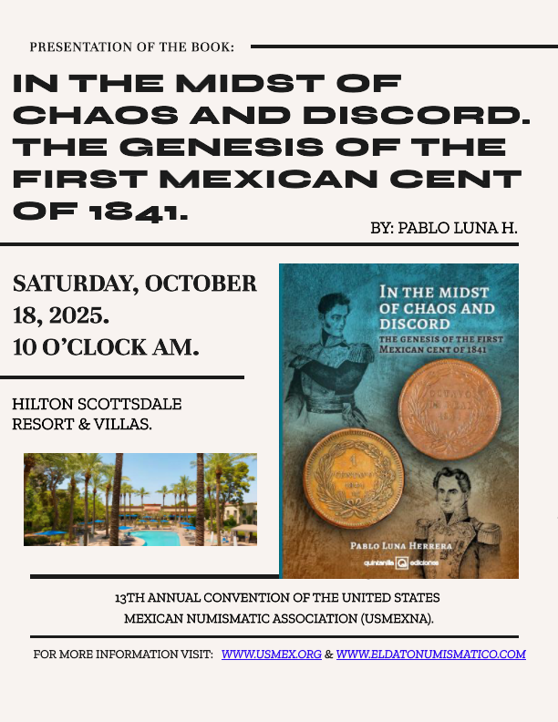 2025. «Entre el caos y la discordia, el origen del primer centavo mexicano de 1841» (In the midst of chaos and discord, the genesis of the first mexican cent of 1841). ISBN: 978-607-8801-72-5.