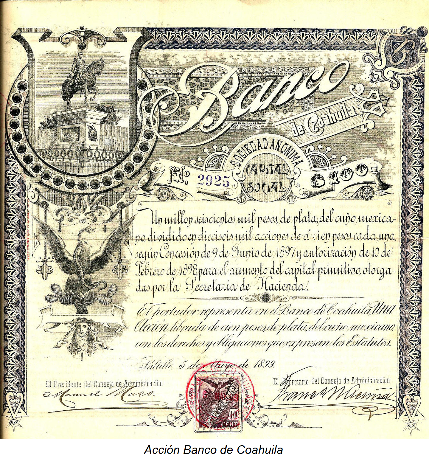 Es por eso que en 1897 un grupo de comerciantes y empresarios fundaron “El Banco de Coahuila”. Entre los principales accionistas destacan: Guillermo Purcell, Pragedis de la Peña, Damasco Rodríguez García, Enrique Maas, Manuel Maso, Marcelino Garza, Crescencio Rodríguez y Francisco Narro Acuña, el Sr. Narro Acuña en dos ocasiones presidio el consejo del Banco de Coahuila llegando a firmar los billetes del mismo. Todos los accionistas eran caballeros relacionados a grandes fortunas, políticos o destacados negociantes.