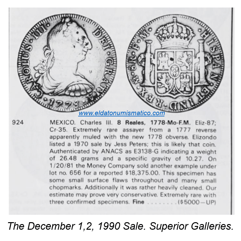 …Sin embargo, existe un notable y debatido ejemplar de esta pieza, fechado en 1772, que consta en el monetario de la Colección Banco de México.