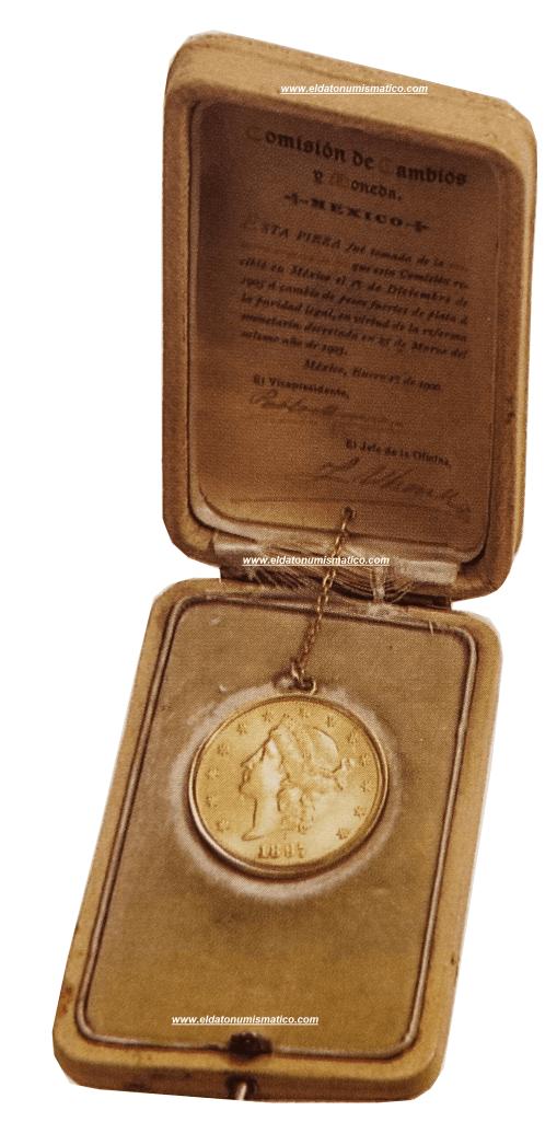 «Comisión de cambios y moneda, México. Esta pieza fue tomada de la primera remesa de oro que esta Comisión recibió en México el 1 de diciembre de 1905 a cambio de pesos fuertes de plata a la paridad legal, en virtud de la reforma monetaria decretada en 25 de marzo del mismo año de 1905. México. Enero 1 de 1906».