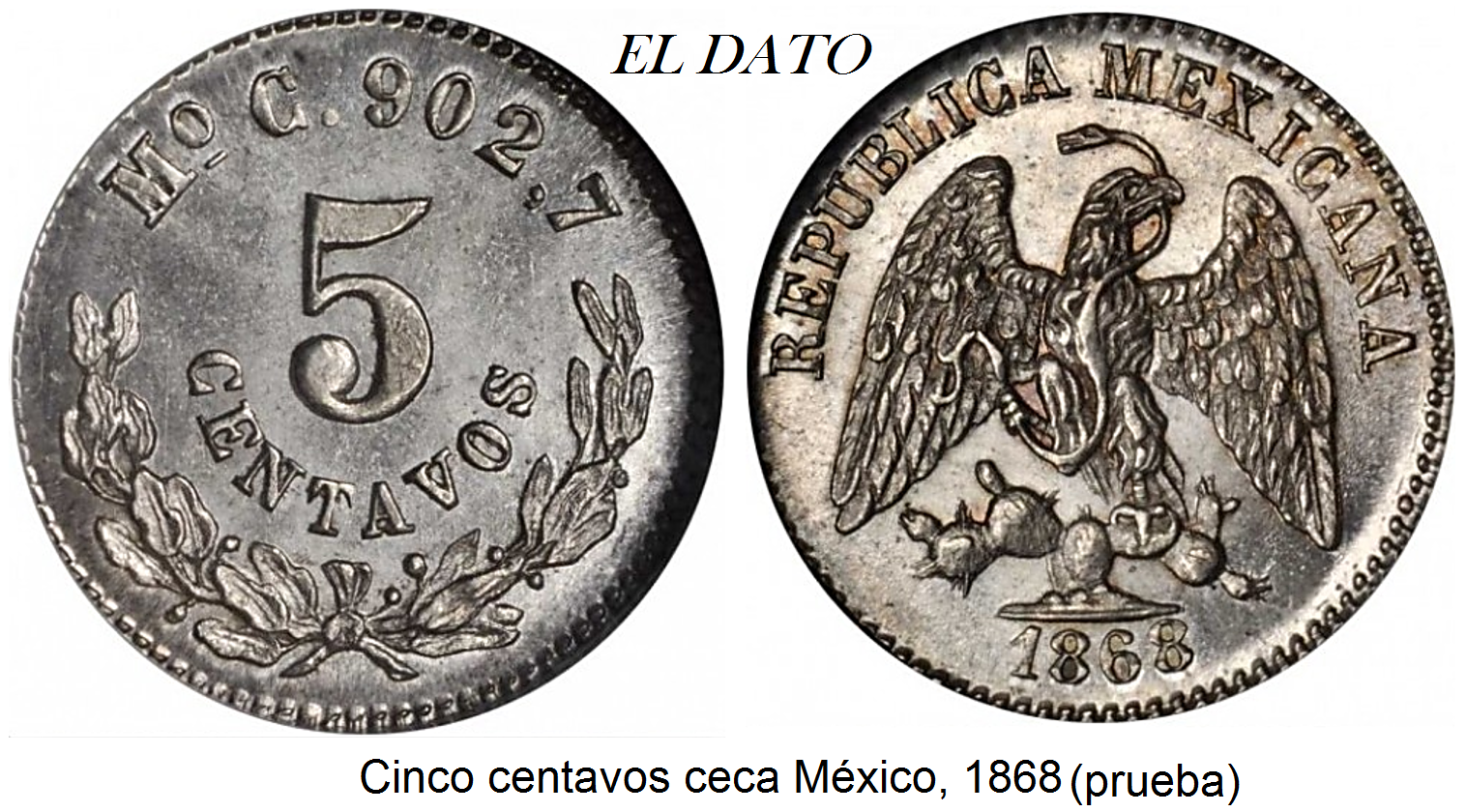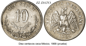 NOTA: Algunos autores refieren ninguna de las monedas de 1868 se consideran pruebas, a excepción de algunos ejemplares que se conocen con coloraciones (composiciones) distintas (silver plated / gold plated).