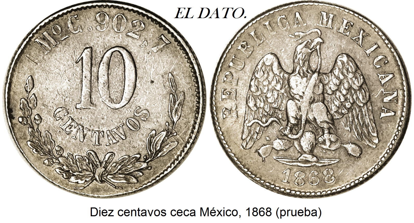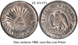 Para la moneda de 10 peso, además del citado ejemplar de 1870 se conoce un segundo ejemplar de 1869 en cobre ceca Mo de la colección Pablo Gerber (No. 43), un tercero ceca Mo en plata de 1871 (No. 46), un cuarto para la ceca de Álamos en plata de 1879 (1983, p. 118).