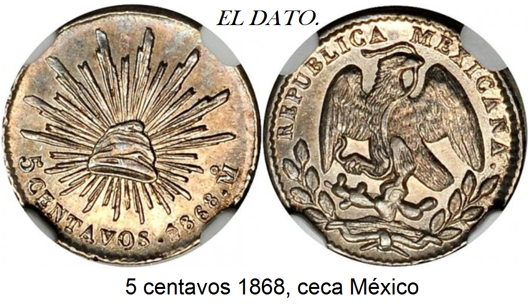 Como se menciono líneas atrás, mismo caso para 10 centavos, también se conoce una variedad 1869/8, que de igual manera ratifica la existencia de matrices del año previo (1868).