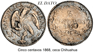 La Casa de Moneda de Chihuahua fue notificada el 22 de Abril de 1868 que tenía que acuñar moneda decimal de 5 y 10 centavos en cantidades mínimas de $500 pesos por mes. Por lo que el 29 de Mayo de 1868 se reanuda la acuñación de moneda fraccionaria decimal (que desde 1863 no se fabricaba en tal ceca) como la que troquelaría S.L.P, se hace mención a la moneda de la siguiente imagen: