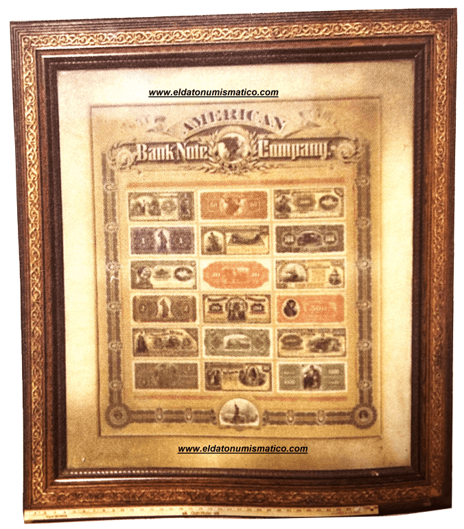 Se trata de un cuadro que contiene pruebas de todos los billetes que la American Bank Note Company le imprimió al Banco Internacional e Hipotecario.