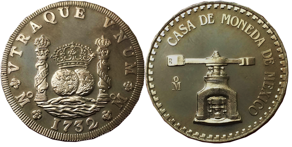 Todo surge hace un año atrás, cuando tengo la oportunidad de ver una pieza que por sus características me dejo intrigado y probablemente a usted también. Una onza de cuproníquel, acabado espejo, con el Columnario (replica) de 1732 y la famosa Prensa de Volante usada en Onzas Troy.