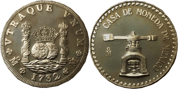 El reverso con la prensa de volante, cabe mencionar la importancia de esta máquina que revoluciono el sistema de acuñación de monedas a nivel mundial. Durante el reinado de Felipe V (1700-1746) introdujo este sistema en España, instalándolas en las Cecas de Madrid y Sevilla hacia el año 1700 y en Segovia en 1732, casi medio siglo después de su introducción en las Cecas de Londres y París, mientras que en México se dispone su uso por primera vez en 1728, fabricándose Columnarios de plata y moneda de oro en 1732.