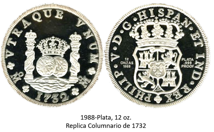 Hoy en día Casa de Moneda comercializa todos los tamaños antes mencionados de tan cónica pieza. Incluso en el 2016 emitieron una nueva edición con chapa de oro en el anverso, para el tamaño de 1 onza. Es de suponer que las medallas que usted puede adquirir hoy en día de la réplica del Columnario son reacuñaciones y no de 1988.
