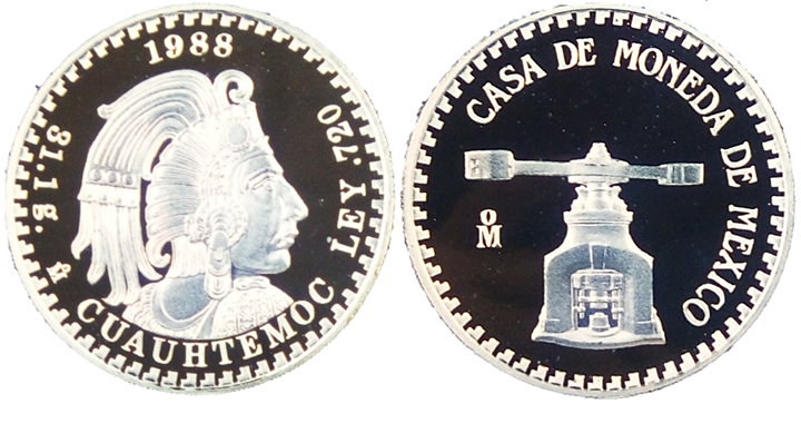 Para esta medalla notamos mismo reverso, pero diferente anverso en comparación la pieza de estudio. Brevemente, se agrega que la presente pieza de Cuauhtémoc/Prensa se troquelo por petición de la empresa “Colonial Coins” de Houston Texas, en ley 0.720, acabado espejo en 1988.