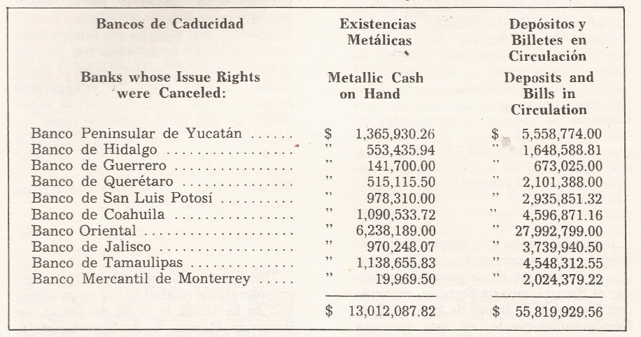 Los bancos declarados en caducidad fueron: Banco Peninsular Mexicano, Banco de Hidalgo, Banco de Guerrero, Banco de Querétaro, Banco de San Luis Potosí, Banco de Coahuila, Banco Oriental de México, Banco de Jalisco y Banco de Aguascalientes. Por otro lado, los bancos de Aguascalientes, Guanajuato, Morelos Durango y Chihuahua se le retiró la concesión por rehusarse a mostrar sus libros de inspección y balances por diversos pretextos. El Banco Minero de Chihuahua retiró sus billetes de circulación y pagó a sus acreedores 5 millones de pesos con certificados de depósitos del Banco Nacional de México el cual fungió como intermediario. La siguiente imagen sintetiza lo anterior: