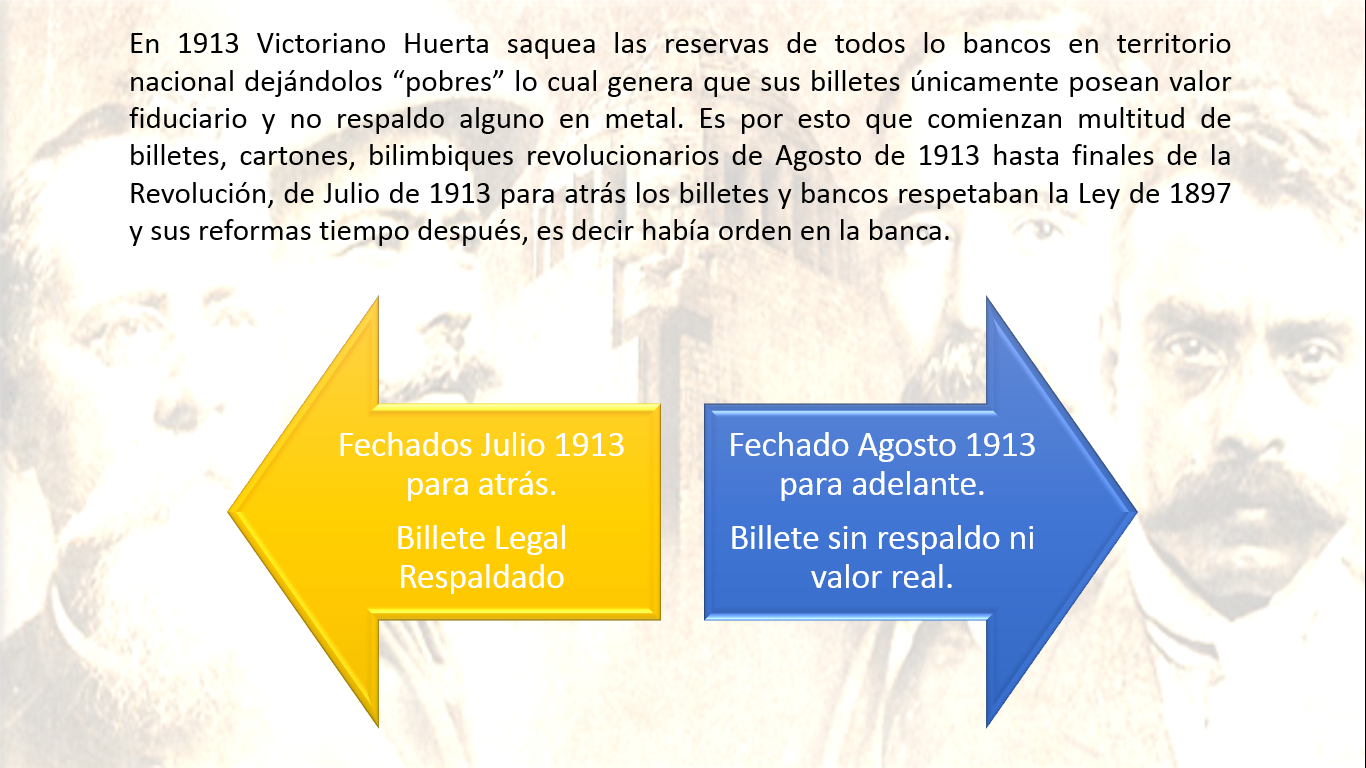 - Revolución constitucionalista: La cual inicia con el asesinato del Presidente Madero y su Vicepresidente, concluye con el derrocamiento de Victoriano Huerta, tuvo su duración en 1913 y 1914, si se emite moneda.