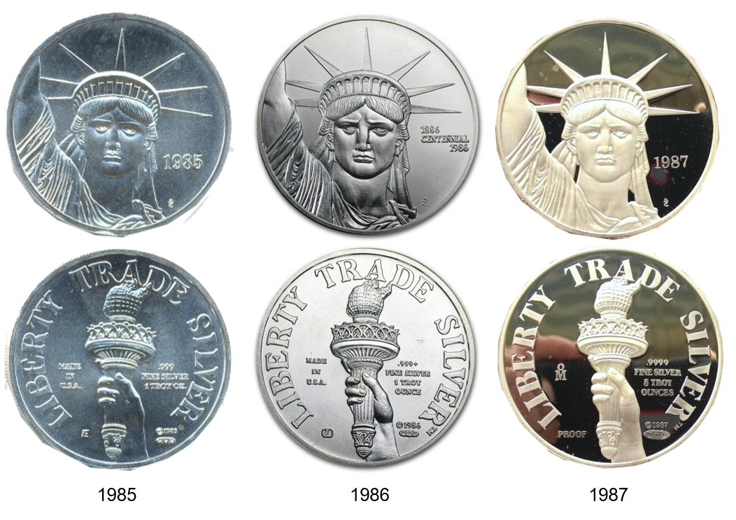 Aun así “Manfra Tordella & Brookes” ya llevaba celebrando este acontecimiento desde 1985 acuñando medallas conmemorativas en 1/10, ½ y 1 onza de plata, estas primeras acuñaciones fechadas en 1985 y 1986 fueron encargo a la compañía minera Engelhard. Y en vista de su éxito en EUA se mandó a hacer una nueva acuñación en México respetando el mismo diseño.