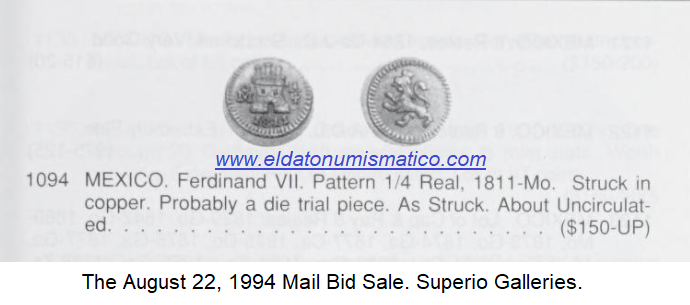 CUARTILLO DE COBRE: En la subasta «The Buddy De Sylva and William Rabun Collections» febrero 6-8, 1978 por Superior Galleries, lote #1545 se ofreció un cuartillo de real de 1811 en cobre, condición sin circular, ligeramente descentrado en la parte inferior. Moneda no catalogada en el libro de Emilio M. Ortíz antes citado.