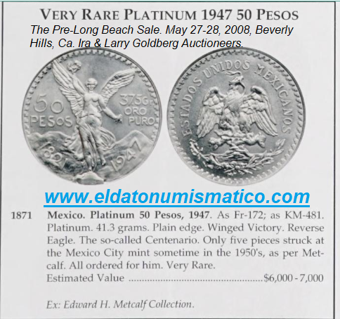 En un artículo publicado en 1978 por Jack Pinayan titulado “Platino: El Mejor de los Metales Preciosos» y retomado en la Gaceta de la Sociedad Numismática de Monterrey Número 8, Año 1 de septiembre de 1978, se relata lo siguiente:
