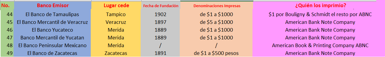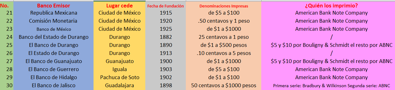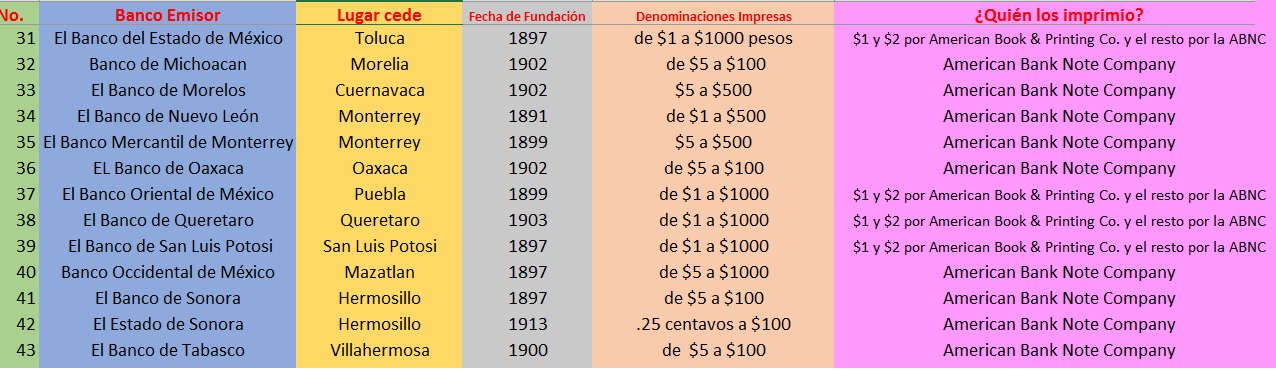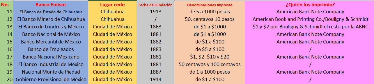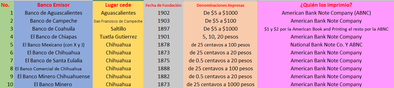 A continuación se enlistan los bancos emisores, el lugar donde radicaban, su fecha de fundación, los billetes que imprimieron en denominaciones y quien los imprimió.