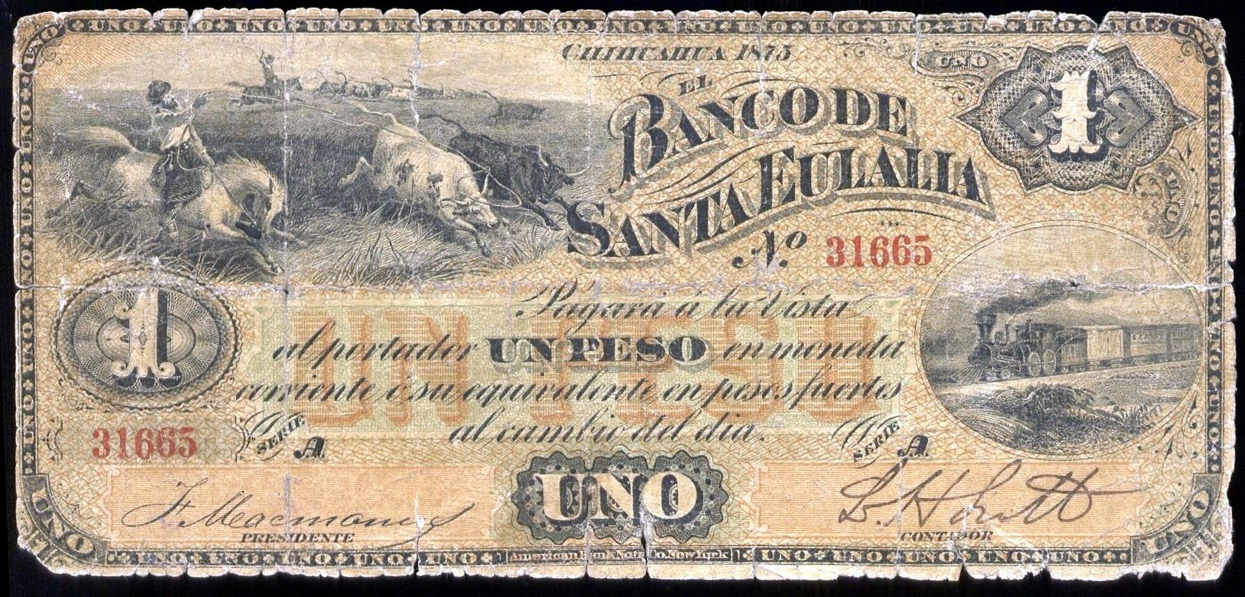 Chihuahua fue un caso excepcional ya que tuvo primer billete impreso que circulo fuera de la Ciudad de México. En 1875 se le concede concesión a Francisco McManus para que emita estos billetes (100 mil ejemplares) siempre y cuando le de crédito al gobierno estatal por 25 mil pesos, él tendría el Banco de Santa Eulalia.